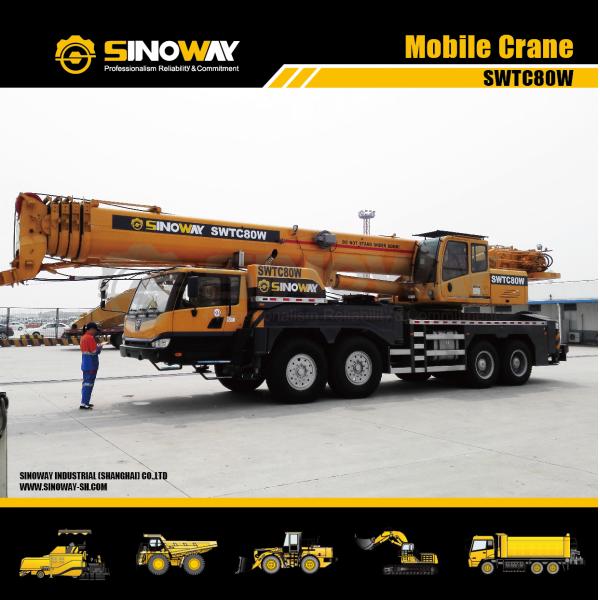 SINOWAY SWTC80W is a truck crane of full range slewing function, telescopic boom sections and pilot-operated proportional controlled systems. The crane adopts self-manufactured full-width 4-axle special purpose chassis (8×4 drive, offering convenient and flexible hydraulically powered steering), providing wide vision, spacious cab and luxurious equipment.